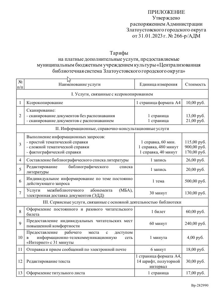 Дополнительные услуги оказываются пользователям ЦБС на основании «Положения о платных услугах», «Перечня стоимости платных услуг», «Правил по предоставлению услуг по копированию и сканированию МБУК ЦБС ЗГО», утвержденных директором ЦБС.