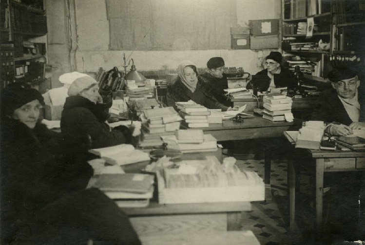 Библиотека не переставала работать. Но правильнее сказать - защищала сокровища Родины. Из отчета: «Своеобразные условия города-фронта: эвакуация, тяжелые условия зимы 41/42 гг., разрушения от бомбежек и артобстрелов выдвинули перед библиотекой необходимость принять срочные меры для спасения книжного имущества, погибающего в разбитых домах, часто наполовину похищенного или сожженного.