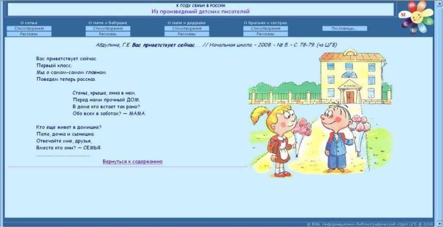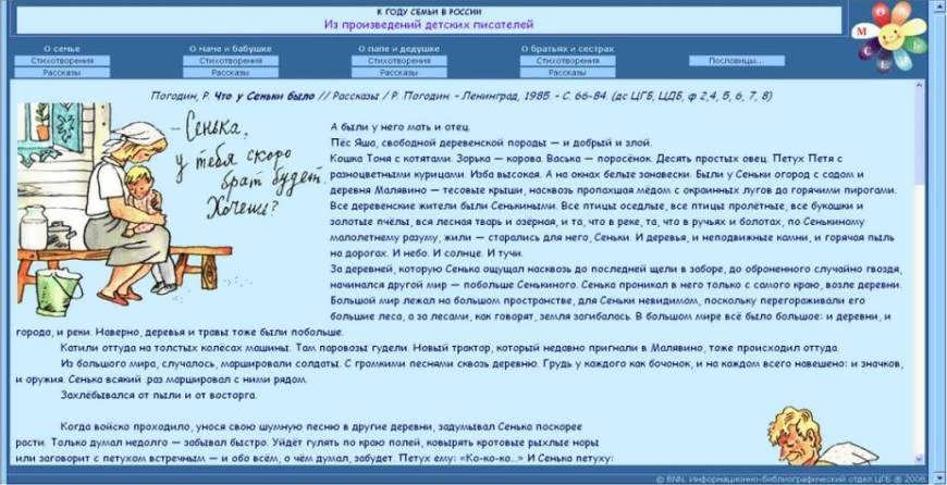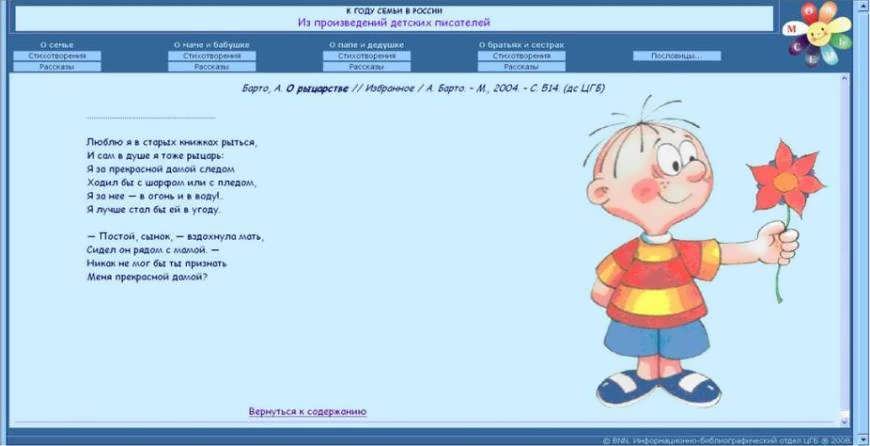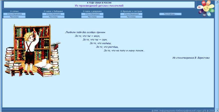 Мы предлагаем Вам познакомиться с библиографической базой данных «Моя семья»,созданной нашим информационно-библиографическим отделом для детей младшего возраста в 2008 году. В нее вошли фрагменты лучших художественных произведений детских писателей о семье.
