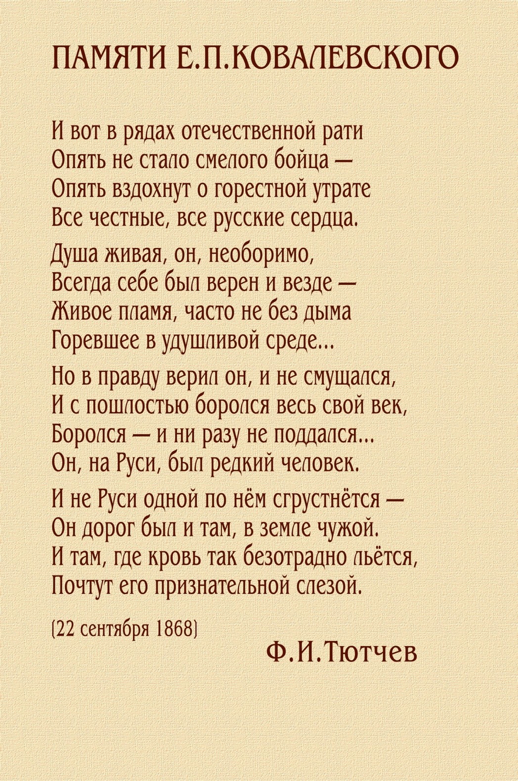 - Тютчев, Ф. И. Памяти Е. П. Ковалевского : [стихи] / Ф. И. Тютчев // Сочинения : в 2 т. – Москва : Правда, 1980. – Т. 1. – С. 196.