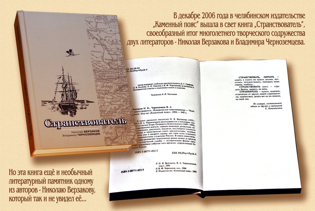 - Верзаков, Н. В. Странствователь : историческое повествование / Николай Верзаков, Владимир Черноземцев. – Челябинск : Каменный пояс, 2006. - 438 с. : ил.