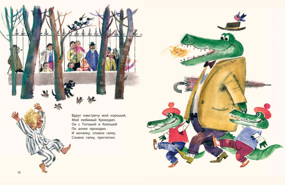 6. - Некоторые герои писателя «кочуют» из одного его произведения в другое. Так, Крокодил из одноимённого стихотворения (он же проглотил солнце в «Краденом солнце», живёт в зоопарке, а в «Телефоне» просит прислать себе, жене и детям «дюжину новых и сладких калош») встречается и в «Мойдодыре». Он гуляет по улице с детьми Тотошей и Кокошей и настолько возмущён неопрятным видом мальчика, что проглатывает его сбежавшую мочалку и угрожает съесть и его самого, если тот наконец не умоется.