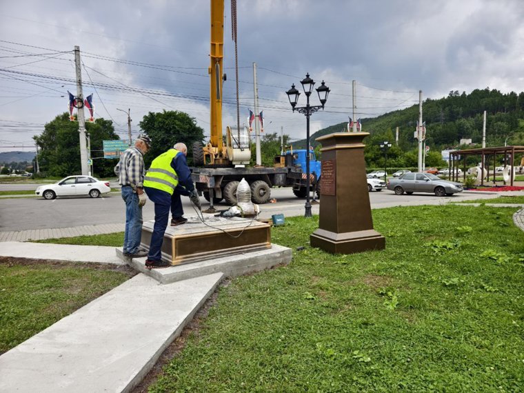 На специально отлитую площадку из бетона рабочие устанавливают пьедестал. Это лишь первая часть всего монумента. А уже через некоторое время здесь появится полный облик исторического объекта – бюст Александра Невского.