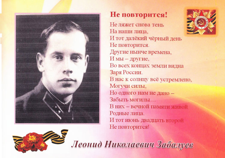 В 2020 году к 75-летию Победы в Великой Отечественной войне литературной студией «Первоцвет» во главе с её руководителем Л. И. Бондаренко была подготовлена книга-альбом «Есть у подвига крылья». В неё вошли работы членов литературной студии о творчестве златоустовских авторов и о войне. Ребята написали о Зое Космодемьянской, о том, какой её описала в своей поэме М. Алигер, о нашем златоустовском знаменитом «черном ноже», о Д. Чудинове, труженике тыла, первом «тысячнике» завода имени В. И. Ленина, представили творчество С. Соложенкиной, В. Бухарцева, М. Львова, посвященное Великой Отечественной войне. Книгу-альбом открывает стихотворение златоустовского поэта-фронтовика Леонида Забалуева «Не повторится!», посвященное трагическому дню для нашей страны – 22 июня 1941 года. Предлагаем познакомиться с замечательными строчками нашего земляка.