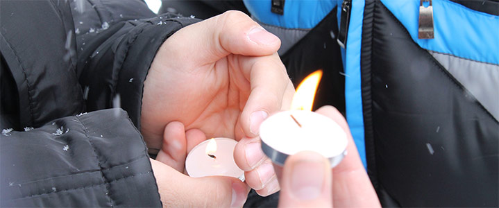 В память о златоустовцах, подвергшихся политическим репрессиям, участники мероприятия вышли на улицу, и на площадке возле библиотеки, зажгли и поставили - на красной звезде, обрамленной колючей проволокой - поминальные свечи, предоставленные Управлением образования и молодежной политики ЗГО.