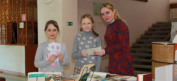 11.03.2016 в ЦГБ проведена акция «Россия и Крым: вместе навсегда». В рамках мероприятия оформлен книжный просмотр, включающий книги и периодические издания, знакомящие с историей, достопримечательностями Крымского полуострова, а также художественные произведения К.Г. Паустовского, А.С. Пушкина, М. Горького, В.В. Маяковского, М.А. Волошина, А.С. Грина и других авторов, посвященные Крыму. Присутствующие стали участниками экспресс-викторины «Все о Крыме», включающей разнообразные вопросы исторического, географического, литературного и культурного содержания. Детям были предложены интеллектуальные игры: пазлы «Герб Крыма», раскраски «Артек», ребусы и головоломки. Торжественность акции обеспечивало музыкальное сопровождение. В мероприятии приняли участие более 200 чел.
