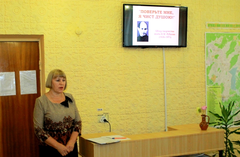20 сентября в информационно-библиографическом отделе Центральной городской библиотеки в рамках Всероссийской акции «Россия читает Рубцова», приуроченной к празднованию 80-летия со дня рождения поэта, прошел обзор на тему «Поверьте мне, я чист душою» для учащихся педагогического колледжа.