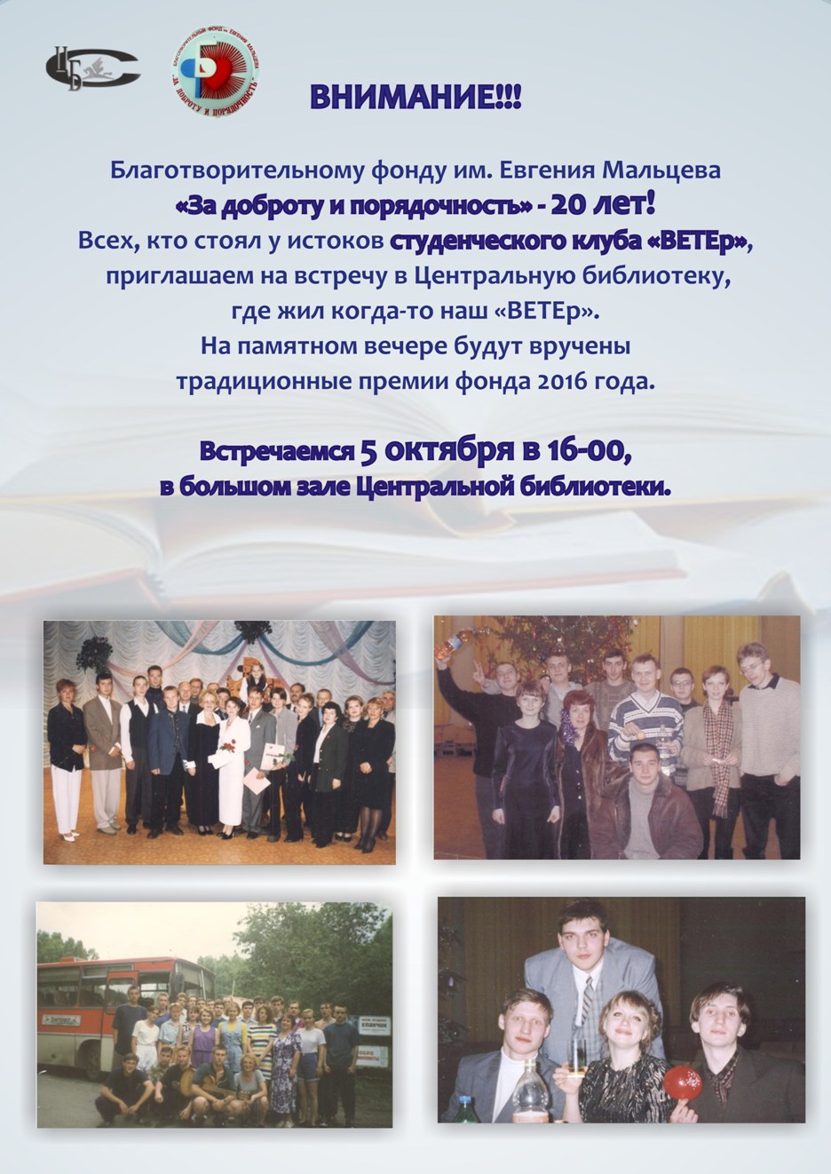 28 September 2016 5 октября 2016 г. памятный вечер студенческого клуба "ВЕТЕр" Добавить комментарий Имя E-Mail Я согласен(а) на обработку моих персональных данных Отменить