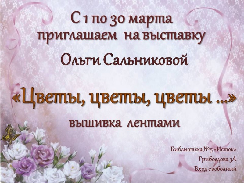 1 марта в библиотеке № 5 по ул. Грибоедова д. 3 «а» открылась выставка «Цветы. Цветы. Цветы…» златоустовской мастерицы Ольги Сальниковой. Прекрасные растения можно вырастить не только в саду или оранжерее, их легко можно сделать своими руками из самых разных материалов – бумаги, ткани, кожи, меха, бисера. Ольга Михайловна создает свои цветы из лент, вышивая картины, делая заколкии броши, сочетая нитки, ленты, пряжу, жемчуг, создает самые настоящие произведения искусства.