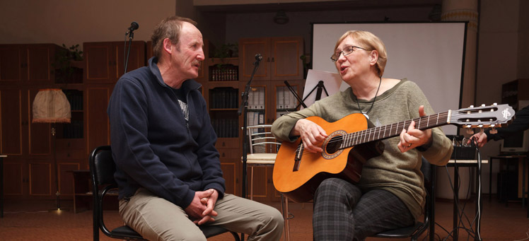 Главными героями встречи в библиотеке стали Вадим Курчатов и Николай Михайлов. Их объединяет любовь к своему городу и природе, увлеченность стихами и бардовской песней. По очереди, как бы ведя диалог друг с другом, читали стихи, пели песни под гитару, рассказывали веселые и грустные истории из жизни.