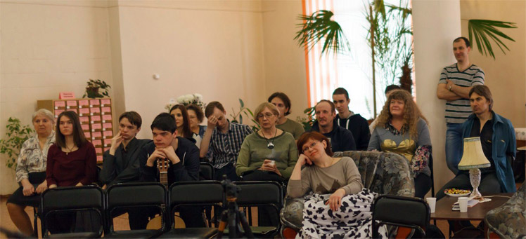 В зале собрались творческие люди: поэты, музыканты, художники, скульпторы, фотографы. Неожиданно и удивительно красиво под гитару прозвучал дуэт Ольги Фокиной и Михаила Полосухина. Свои необычные стихи прочел Дмитрий Медоуста. Не остались в стороне и участники литературно-театральной группы «МиЛиТ», действующей при библиотеке. Герман Митяй порадовал своими песнями под гитару, а Алексей Холов стихами и вальсом, исполненным на фортепьяно. Чудесными и диковинными рисунками поделилась Инга Биктеева, художник и поэт.
