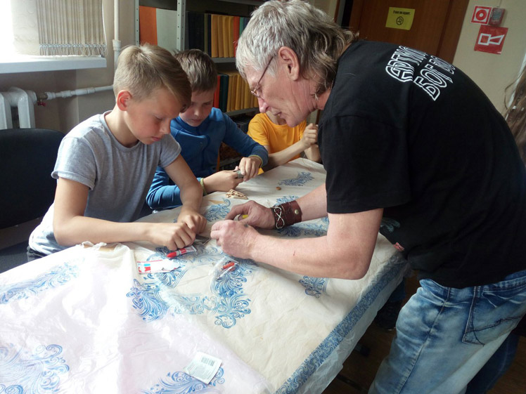 Мастер-классы проводятся на площадках оружейных компаний, в Этнодеревне, а ребята на встрече смогли принять участие в мастер-классе «Сувенир из Златоуста». Его подготовил и провёл наш читатель, большой друг библиотеки, руководитель студии «Уральский сувенир» в ДК Металлург Поткин Сергей Александрович. Под его руководством ребята изготовили сувениры, брелки из натуральных камней и капового корня, которые представляют уральский природный материал, чудеса уральской природы.