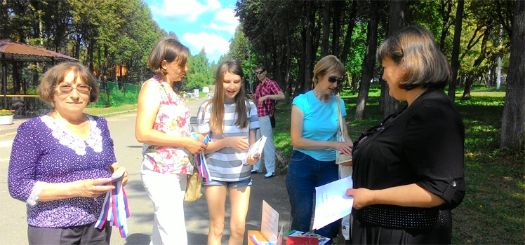 22 августа в 13.00 сотрудники библиотеки № 21 «Дом Друзей» и детской библиотеки № 6 в детском парке района машиностроительного завода провели флешмоб «Мы вместе под флагом России». Цель – популяризация праздника – День Государственного флага России среди жителей Златоуста.