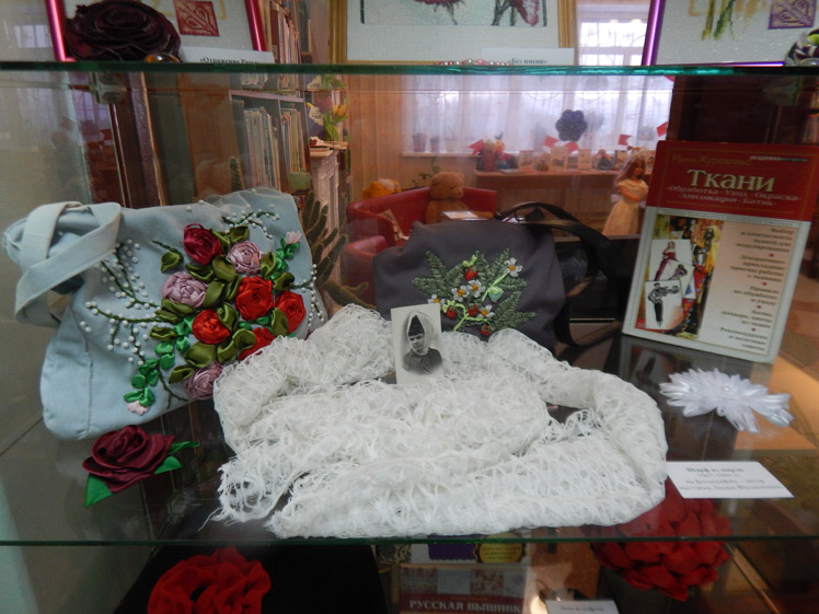Первая выставка – это картины вышитые крестом, причём одна из них натюрморт «Южная ночь», начата была ещё мамой нашего автора. Вторая выставка оформлена в фойе. Здесь можно увидеть сумки, броши, вышитые салфетки, книги по рукоделию. Но самым главным украшением является фотография автора 1967 года, здесь она в шарфе. Шарф, сделанный из обычной марли, до сих пор носится и его вы тоже можете увидеть. Лидия Филипповна вместе с родной сестрой Надеждой наши самые активные читатели. У них многодетная дружная семья. Рабочий стаж нашего автора 40 лет. Всю жизнь работала в Узле связи. Ее добрые, талантливые руки до сих пор создают не просто красоту, а вещи, которые практичны, красивы и удобны.
