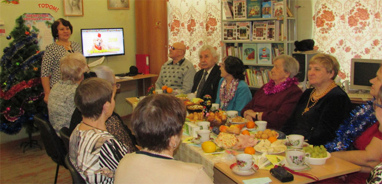 Ветераны узнали о традициях празднования Нового года, когда и кто придумал этот праздник, почему мы наряжаем ёлку и откуда взялись Дед Мороз и Снегурочка, прослушали историю новогодних открыток и гороскоп на следующий год. Нина Григорьевна Гордеева в костюме символа следующего года – собаки, прочитала стихи с поздравлениями. Иван Григорьевич Фирюлин исполнил песни на стихи собственного сочинения. Праздничная презентация и представленные книги на выставке «Новогодний калейдоскоп», сделали мероприятие более наглядным. В тёплой, душевной атмосфере, за чашечкой чая, поздравляли ветераны друг друга с наступающим Новым годом. Незабываемая праздничная атмосфера, музыка, ёлка, конкурсы и подарки, общение и новогодние пожелания, дали много положительных эмоций всем присутствующим на новогодних посиделках.