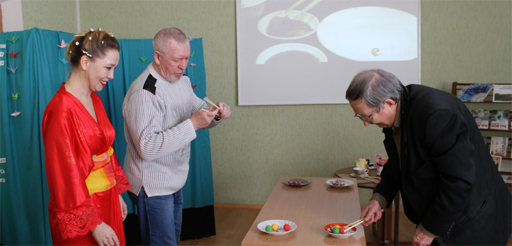 В гостиной читателей встретила ведущая - Кондратьева Наталья, которая в образе японской девушки предложила совершить виртуальную прогулку по стране восходящего солнца. Путешествие было необычным. Присутствующие познакомились с домашним бытом японцев, особенностями национального гостеприимства, национальной кухни, национальной чайной церемонии. Гости отгадывали японские загадки, соревновались в искусстве этикета с использованием вместо традиционных столовых приборов - палочек.