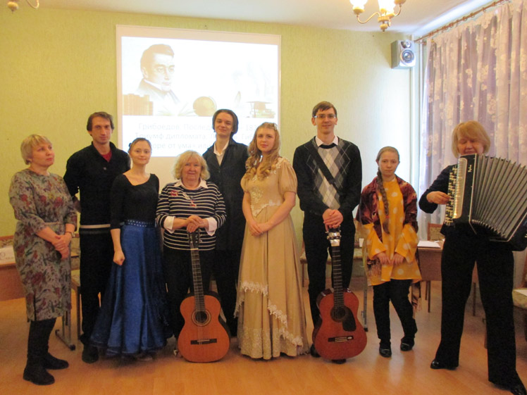 Об удивительной судьбе образованнейшего, талантливого человека, дипломата, прекрасного музыканта, возившего пианино во все свои командировки по Кавказу, прекрасного поэта, написавшего бессмертную комедию «Горе от ума», шла речь на встрече. Ведущая клуба - Наталья Галавтина, ярко и эмоционально рассказала о трагической судьбе дипломата, любившего Родину и российский народ, бесстрашно отстаивавшего интересы государства и соотечественников и сложившего голову за честь державы. Участники Клуба любители литературы представили сцены из комедии «Горе от ума», исполнили Грибоедовский вальс и песни.