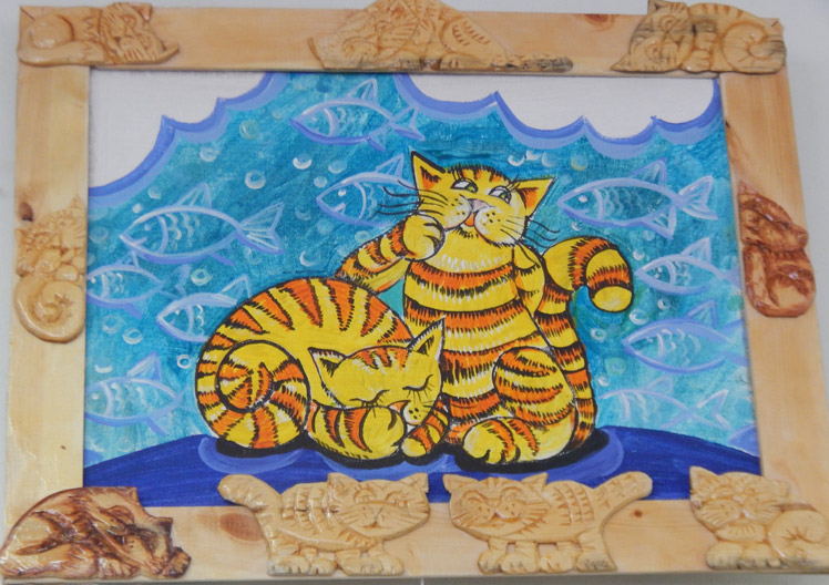 Необычность выставки и в том, все рамки картин вырезаны самим автором из дерева и на некоторых из них тоже коты.