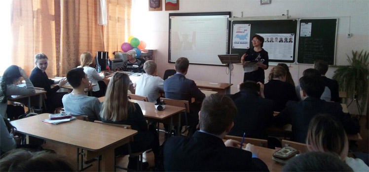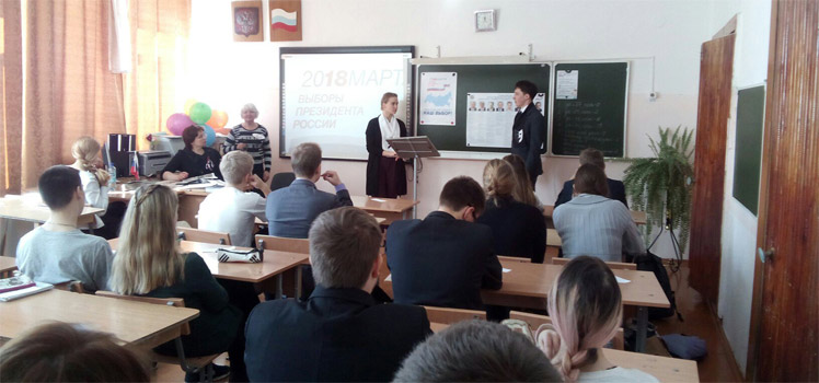 Учащиеся рассуждали о значении выборов, ответили на вопросы анкеты, приняли участие в дуэли, во время которой высказывали своё мнение «за» и «против» выборов. Вызвали интерес молодёжи программы кандидатов в президенты Российской Федерации. Закончился урок призывом перестать быть равнодушными, уже в юном возрасте приучать себя следить за жизнью общества, развивать свою общественную позицию. Директор школы Сергей Ряхов рассказал о том, как проходят выборы, и поблагодарил организаторов за интересный урок, а учащихся за плодотворную работу.