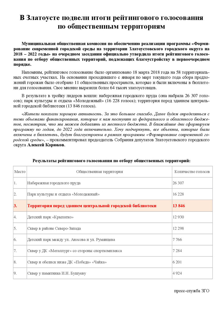 28 March 2018 Итоги голосования по общественным территориям Добавить комментарий Имя E-Mail Я согласен(а) на обработку моих персональных данных Отменить