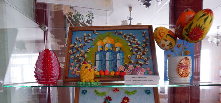 Накануне Пасхи в одной из витрин второго этажа ЦГБ оформлена выставка, состоящая из работ талантливых читателей и друзей сектора комплексного обслуживания. Все они посвящены Светлому православному празднику. Это и коллективные работы учеников православной школы (руководитель Маркобрунова Л.Ф.), выполненные в технике квиллинга, и пасхальные яйца, расписанные красками Николаевой Н.А. , Куликовой М.П., и великолепное бисерное яйцо Русиной Т.П., а также икона и картина с пасхальными мотивами в технике вышивки бисером Борисовой О.П.