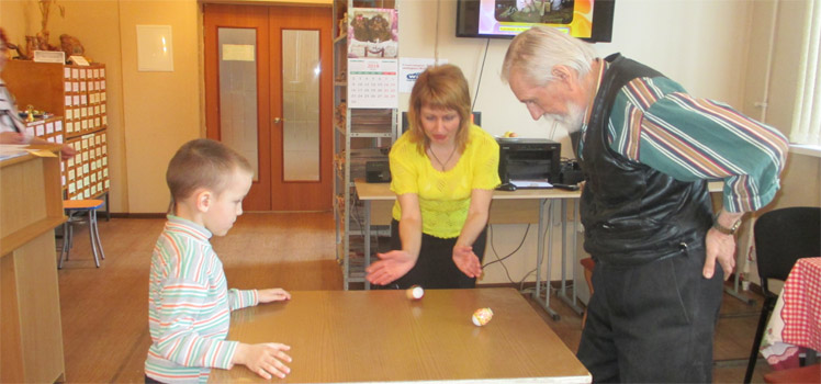 Для детей это был праздник «Пасхальная радость». Надо было видеть лица ребят, когда они слушали рассказ библиотекаря (Слепова О.А.) о страданиях Иисуса Христа, о его Распятии, о его Воскрешении. Рассказ сопровождался показом видеосюжета с праздничной Всенощной службы и Крестного хода. Приятно было узнавать, что ребята не только знают о традициях Пасхи: крашении яиц, выпечки кулича и пасхи. Ребята принимают участие в приготовлении всего этого дома и во многих семьях соблюдается пост, посещают церковь. Заканчивались встречи пасхальными играми: катанием яиц, чоканьем, пасхальным хороводом. Уходя из библиотеки, ребята продолжали напевать разученную на встрече песню «Гори, гори ясно, чтобы не погасло…». К празднику была подготовлена красочная слайд-презентация «Светлое Христово Воскресенье» (Ганиева А.З.).