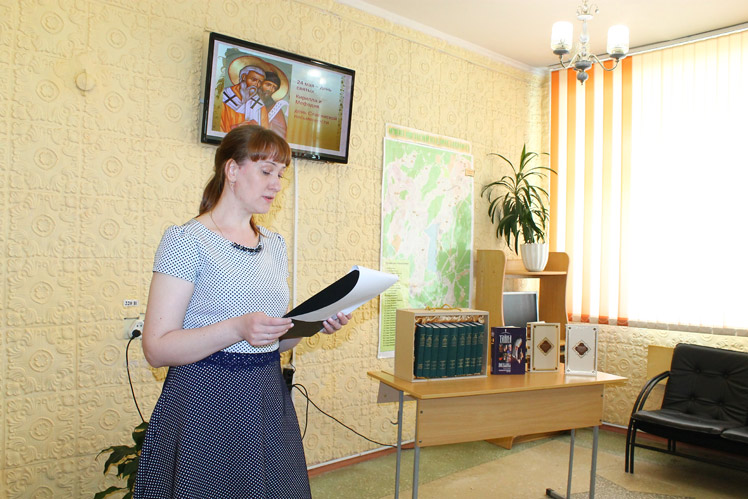 Открыли презентацию молодые читатели стихотворением о духовном подвиге святых братьев Кирилла и Мефодия, благодаря которым у наших предков–славян появилось письменное слово и книга.