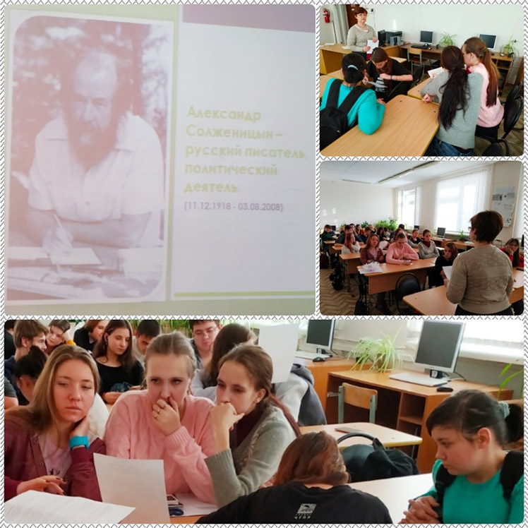 11 декабря к 100-летию со дня рождения всемирно известного русского писателя Александра Солженицына, ведущий библиотекарь зала молодёжного чтения и коммуникаций ЦГБ, провела для студентов Златоустовского индустриального колледжа имени П.П. Аносова час размышлений «Праведность по Солженицыну».