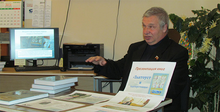 В библиотеке №2 «Аист» состоялась презентация книг Юрия Петровича Окунцова «Златоуст и златоустовцы». Вышла из печати три тома этих замечательных книг, которые с полным основанием можно назвать энциклопедическими изданиями. Автор этих книг краевед, историк, заслуженный работник культуры, более 35 лет работающий заведующим Отделом истории в Городском краеведческом музее.