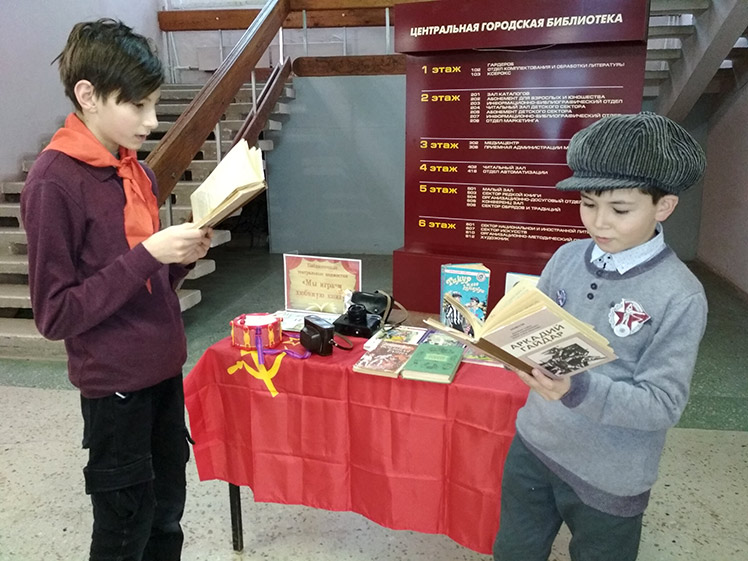 И фойе Центральной библиотеки превратилось в импровизированные театральные подмостки. Аркадий Гайдар – один из любимых писателей людей разных поколений, поэтому в акции с удовольствием принимали участие и дети и взрослые, представляя себя в роли Тимура и Мишки Квакина из повести «Тимур и его команда», Мальчишом-Кибальчишом и Буржуином из «Сказке о военной тайне», Марусей и Светланой из «Голубой чашки» и другими персонажами А. Гайдара.