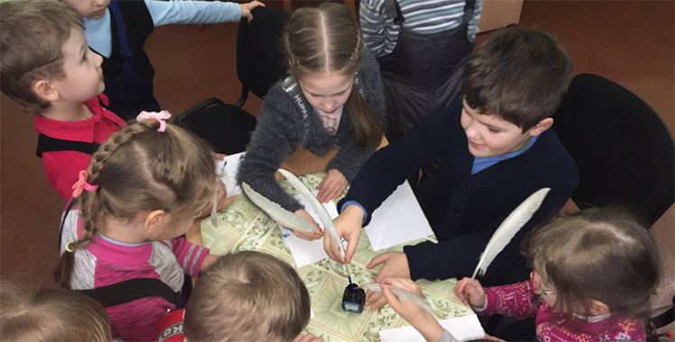 На познавательно - игровом часе «Напиши мне письмо…» младшие школьники погрузились в историю рождения первых писем - сообщений, почувствовали себя первооткрывателями вместе с героиней Р. Киплинга девочкой Таффи. Ребята создавали письмо – рисунок, вычерчивая его заостренной палочкой, знакомясь с наукой – пиктографией. Узнали о «предметных» сообщениях древних племен, о появлении первых финикийского и греческого алфавитах, познакомились с «узелковой славянской книгой», с историей создания славянской кириллицы, пробуя писать на ней настоящими гусиными перьями, как это делали их ровесники много веков назад.