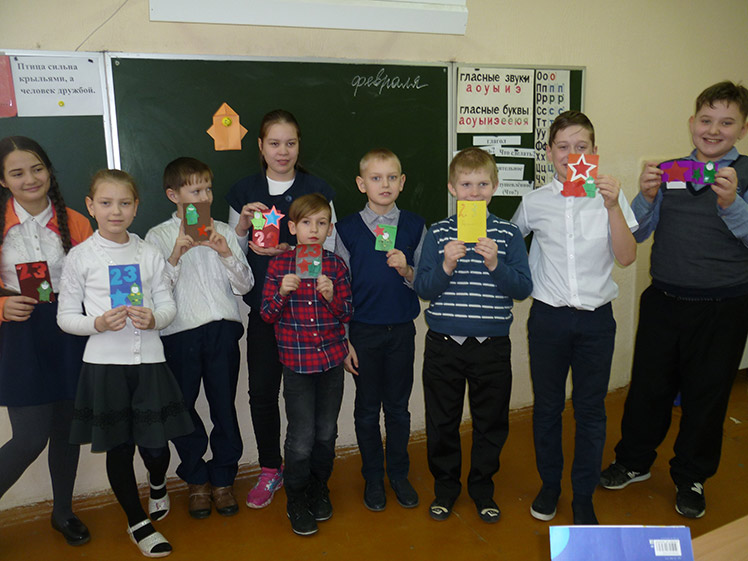 Ребятишки очень ответственно выполняли команды главнокомандующего (Мымрина Анна): маршировали по кругу, завязывали узлы, скакали на лошади. А кто отлично работает, тот хорошо отдыхает! Все приняли участие в весёлых играх: «Парашютисты», «Кочки на болоте», «Лётчики», «Кто быстрей!». Все веселились и остались довольны. Школьники 4 – х классов приняли участие в мастерилке по изготовлению праздничной открытки «Будем Родине служить!». Не так просто сделать открытку своими руками! Алябышева Елена и Чистякова Ксения объяснили правила вырезания сложных деталей и порядок склеивания. Дети приступили к работе. Не сразу у всех получилось, но постарались и сделали красивый подарок для пап, дедушек, братьев и друзей.