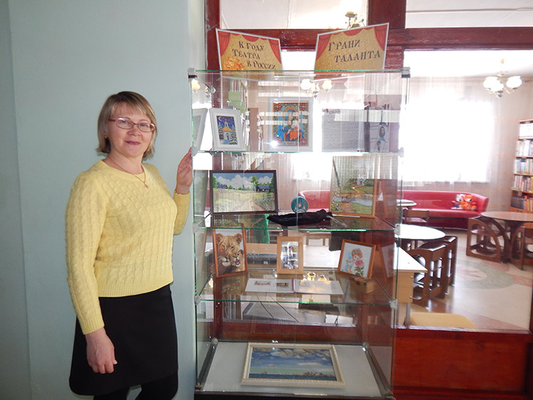 Эстафетную палочку актриса передала ещё одному творческому работнику театра Почиваловой Татьяне Леонидовне. Выставка её работ открылась 26 февраля в фойе 2-го этажа ЦГБ. Она представляет зрителю нежный проникновенный женский мир. Вышивка крестиком завораживает.