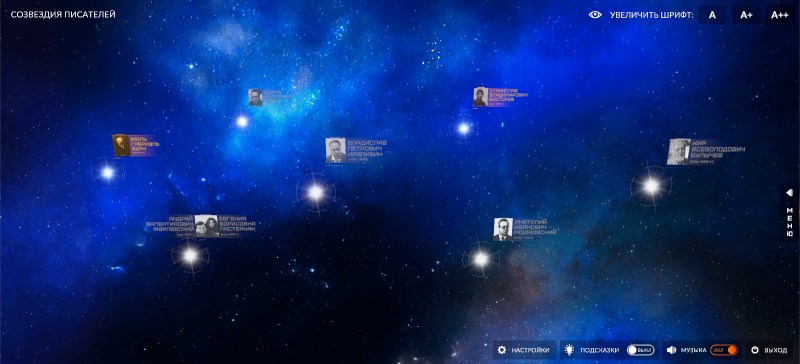 «Литературная Вселенная» - это своеобразная литературная галактика, где каждая звезда носит имя определенного автора. Писатели представлены краткой биографией, фотогалереей, интересными фактами, библиографией. В ресурсе предусмотрена интерактивная игра для юных пользователей, желающих испытать себя в литературном творчестве.