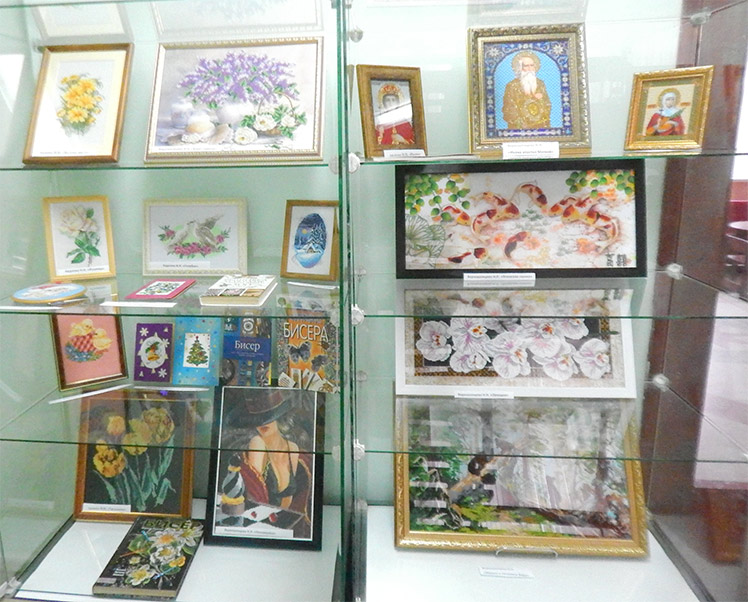 Работы талантливых читательниц выставлены в стеклянных витринах на 2-м этаже библиотеки. На выставке представлены картины, вышитые бисером и нитками в разных интерпретациях. На полотнах – иконы, пейзажи, забавные животные, цветы.
