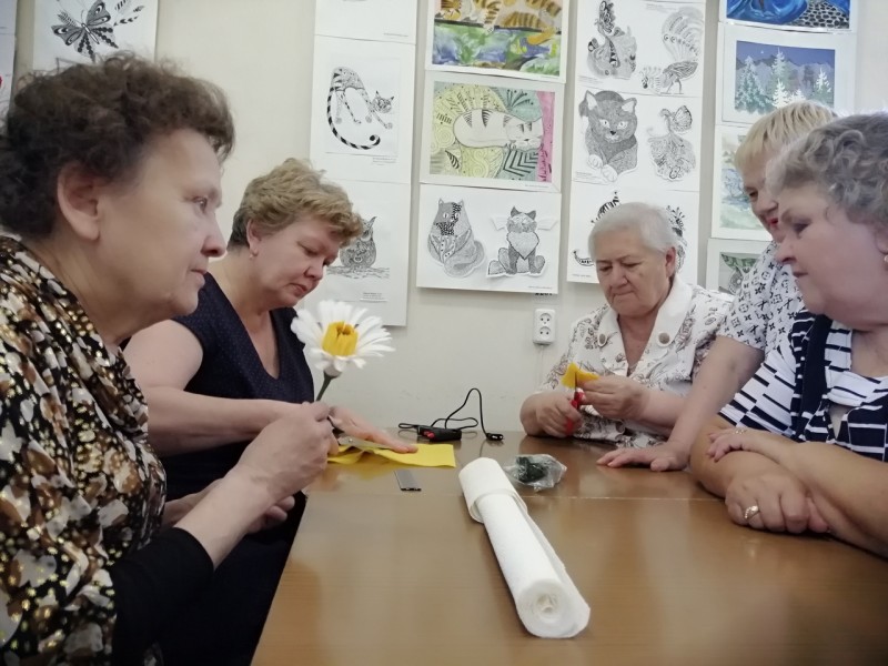Вместе с библиотекарями члены клуба разобрали приемы изготовления ромашки из бисера, цветной и гофрированной бумаги, шелковых лент, фоамирана. Лучезарный цветок русских полей и лугов, сделанный своими руками – лучший подарок родным на День семьи, любви и верности.