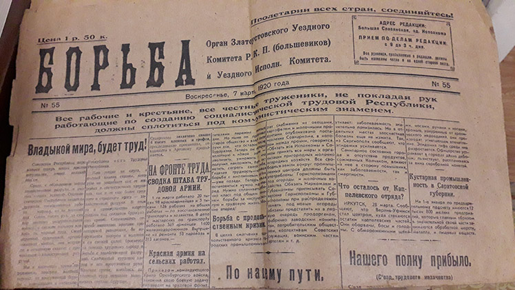 На встрече литературно-поэтической гостиной «Светоч» «Юбиляры: люди и книги», посвященной 265-летию города Златоуста заместителем городской общественной организации «Союз женщин» Лейман Еленой Анатольевной преподнесен в дар ЦГБ редкий экземпляр городской газеты «Борьба» за 1920 год. Газета выходила всего несколько месяцев. Это неоценимый подарок для краеведов города. Благодарим Елену Анатольевну за уникальный презент. Приглашаем заинтересованных читателей познакомиться с такой находкой в секторе редкой книги.
