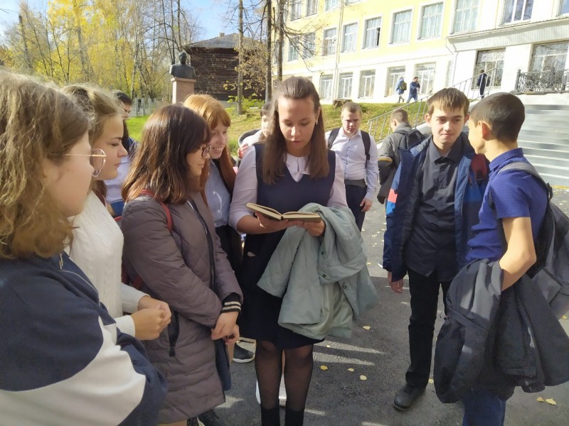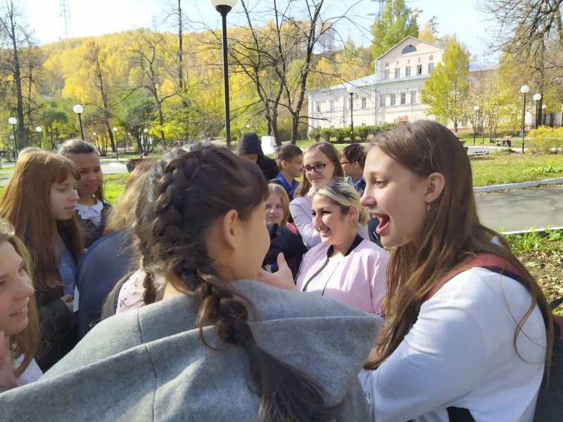 Следующим заданием было собрать пазлы, на которых изображена работа И.Н. Бушуева «Древнее вооружение» и угадать улицу с именем знаменитого златоустовского гравера. Далее на улице Аникеева ребята разгадывали шифр по книге «Златоуст – город крылатого коня», который стал ключом к заданию о первом театральном представлении, состоявшимся в 1920 г. в Златоусте.