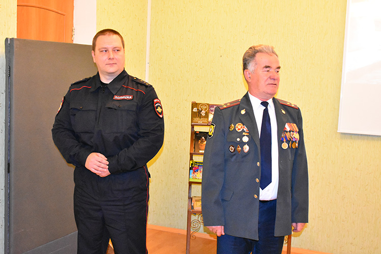 Заключительным и важным моментом вечера стало присутствие и выступление на нем представителей правоохранительных органов. Паутов Виктор Григорьевич, полковник полиции в отставке, рассказал о себе, своей семье, нелегкой работе. Капитан полиции Макавеев Александр Владимирович продолжил рассказ своего учителя и наставника. Участники встречи задавали вопросы о правопорядке в городе, стране.