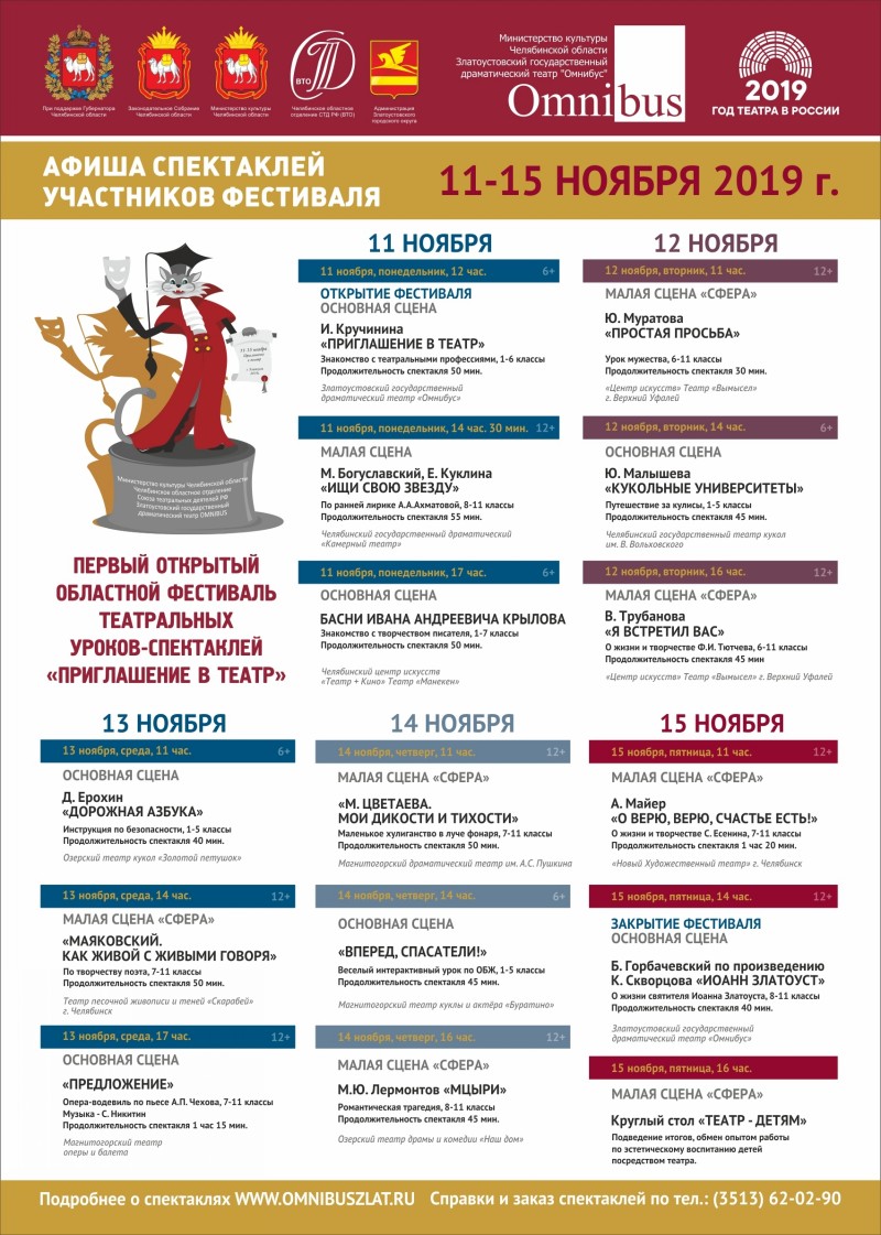 Первый областной фестиваль театральных уроков-спектаклей «Приглашение в театр» стартует 11 ноября в Златоусте. В конкурсе примут участие 12 театральных коллективов, в том числе пять челябинских.