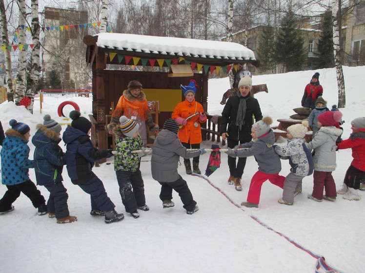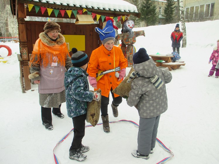 На площадке детского сада № 4 детей ждали Скоморох и Хозяюшка – переодетые библиотекари. Герои праздника рассказали, что такое Масленица и как ее празднуют. Детсадовцы пели частушки и участвовали в веселых конкурсах: «Перетягивание каната», «Бой подушками», «Прыжки в мешках». Скоморох научил детишек старорусской игре «Птички». Хозяюшка устроила блинный аукцион и провела игру «Испеки блин».