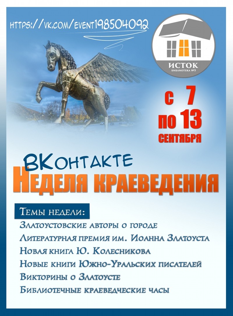 Ко дню рождения Златоуста библиотека №5 «Исток» подготовила Неделю краеведения в дистанционном режиме. На странице «ВКонтакте» оформлены электронные выставки, буктрейлеры, интеллектуальные задания, подборки по теме «Златоустовские авторы о родном городе».
