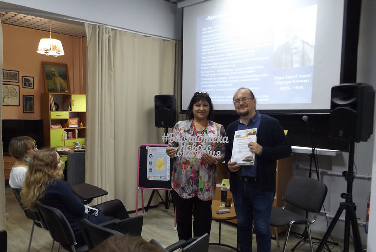 Все присутствовавшие на час погрузились в удивительный мир героев книг Дьюи Мелвилла «Моби Дик, или Белый Кит» и Марка Твена «Гекльберри Финн», став участниками захватывающих литературных приключений. На примере двух знаменитых произведений лектор раскрыл этапы становления американской литературы.Все, затаив дыхание, слушали Александра Сергеевича. Час, отведённый для встречи с интересным во всех отношениях лектором, пролетел, как одно мгновение. Хотелось бы, чтобы такие значимые, интересные события происходили чаще в жизни библиотечной системы и города.
