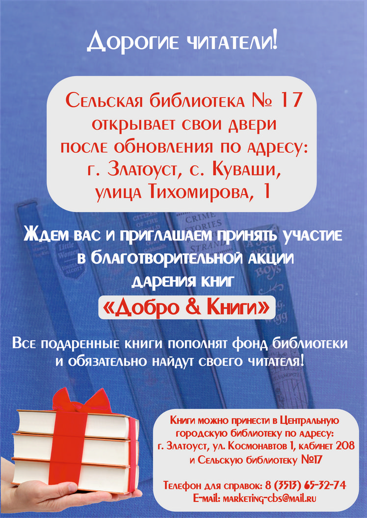 Приглашаем вас принять участие в благотворительной акции дарения книг "Добро & книги". С Вашей помощью мы сможем пополнить фонд библиотеки №17 и каждая подаренная Вами книга, найдет своего читателя!