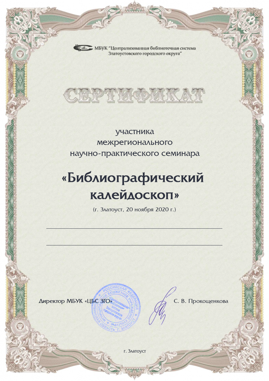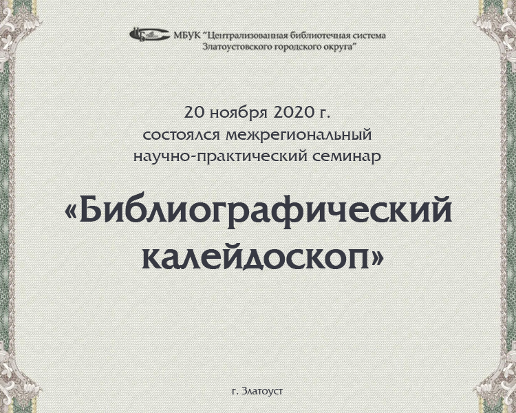 20 ноября 2020 года в онлайн-формате состоялся межрегиональный научно-практический семинар «Библиографический калейдоскоп». Семинар организован в рамках совместного проекта Челябинского государственного института культуры и ЦБС Златоустовского городского округа «Лаборатория профессионального творчества». Проект реализуется с 2016 года. За это время было организовано более 10 обучающих профессиональных мероприятий. Их главная особенность – практическая направленность.