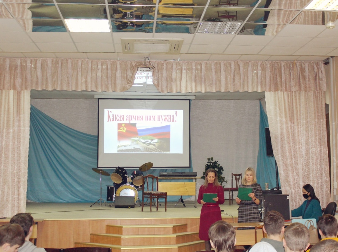 Студенты ответили на вопросы интеллектуальной викторины и разобрали проблемные психологические ситуации, связанные с прохождением службы в армии. Подводя итоги обсуждения, сотрудники библиотеки провели блиц-опрос, где требовалось одним словом ответить на вопрос «Какая армия нам нужна?».