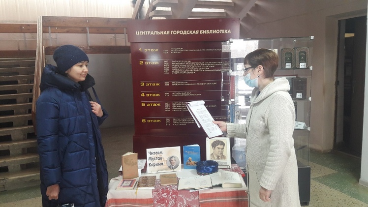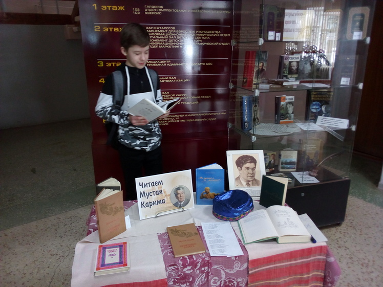 Акция «Читаем Мустая Карима» состоялась в офлайн-формате 3 марта в фойе Центральной библиотеки: оформлена книжно-предметная выставка, посвященная классику башкирской советской литературы.