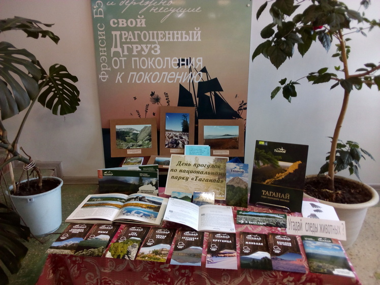В фойе ЦГБ организована книжная выставка, на которой представлены книги о Таганае, краеведческая литература, информационные проспекты и фотографии таганайских достопримечательностей. Читателям предлагалось поучаствовать в разнообразных викторинах по истории национального парка, угадать «по следам» животное, по аудиозаписи – птицу.