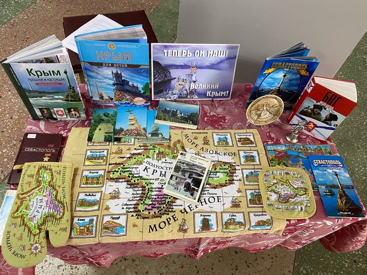Сотрудниками отдела обслуживания ЦГБ оформлена книжная выставка-инсталляция, которая знакомила читателей с литературой о полуострове Крым, его государственных символах, природных и культурных достопримечательностях, писателях и поэтах, прославляющих Республику.