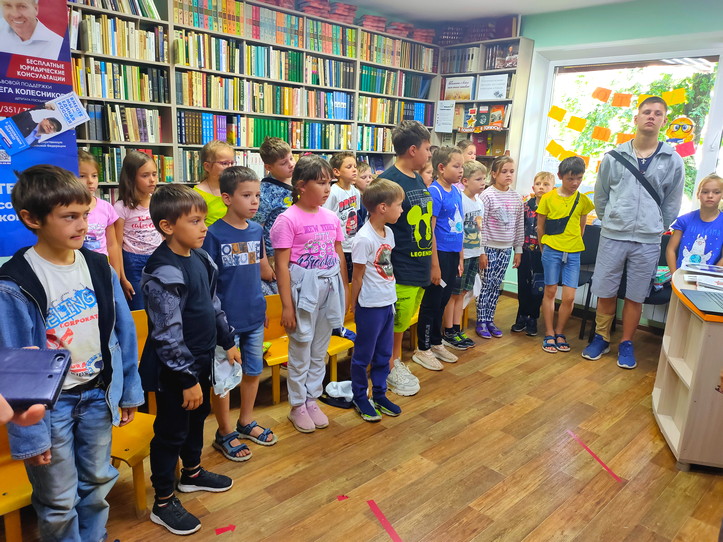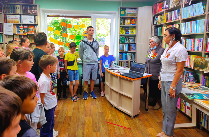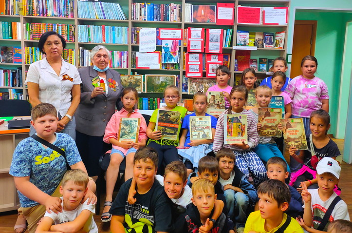 На встречу с книгой о войне пришли дети из школьного лагеря школы №15. Библиотечная акция началась в 10:00 часов с прослушивания голоса Юрия Левитана о начале Великой Отечественной войны. Ребята посмотрели фильм о первых днях войны, познакомились с книгами Анатолия Митяева и Сергея Алексеева, узнали о детской серии «Дедушкины медали». В гости к ребятам пришла ветеран войны Мустафина Фануза Шайдулловна. Маленькой восьмилетней девочкой она была эвакуирована в 1942 году из Ленинграда на Урал. С большим интересов дети слушали рассказ ветерана о первых днях войны, о том, как в трудное время дети учились и работали на полях и на заводах, помогая фронту. Ребята делились историями своей семьи, ведь их прадедушки и прабабушки были участниками военных сражений, помогали фронту, ковали Победу в тылу.